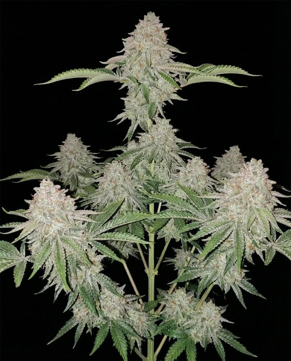 Die Pflanze erreicht eine kompakte Höhe von 90–110 cm, was sie ideal für den Indoor-Anbau in Zelten und Schränken macht. Trotz ihrer geringen Größe sind die Erträge beeindruckend: 550–650 g/m? Indoor bei einer Blütezeit von nur 7–8 Wochen. Die Knospen sind olivgrün mit dunklen violetten Flecken, bedeckt mit orangefarbenen Stempeln und einer dicken Schicht Trichome.